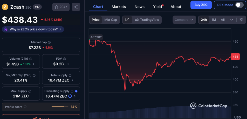 ปัจจุบัน Zcash (ZEC) แม้จะมีการฟื้นตัวจากจุดต่ำสุดแล้วแต่ก็ยังไม่สามารถกลับมายืนเหนือระดับราคาที่ร่วงลงจากเมื่อวานได้ส่งผลทำให้มีการซื้อขายกันในระดับราคา $438 ลดลง 5.1% ในช่วง 24 ชั่วโมงที่ผ่านมา