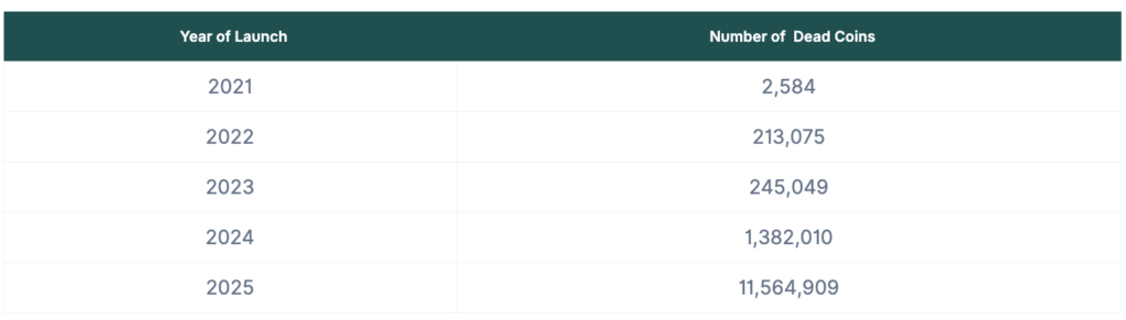 ข้อมูลจาก CoinGecko ล่าสุด เผยให้เห็นความโหดร้ายของตลาดคริปโตในปี 2025 ที่ผ่านมา โดยมีโทเคนที่ล้มเหลว และกลายเป็น “เหรียญล้มตาย” สูงถึง 11.6 ล้านโปรเจกต์ ภายในปีเดียว ซึ่งกลุ่มที่เป็นต้นเหตุหลักคือ บรรดาเหรียญมีมที่เน้นกระแสชั่วคราวแต่ไม่มีพื้นฐานรองรับ
