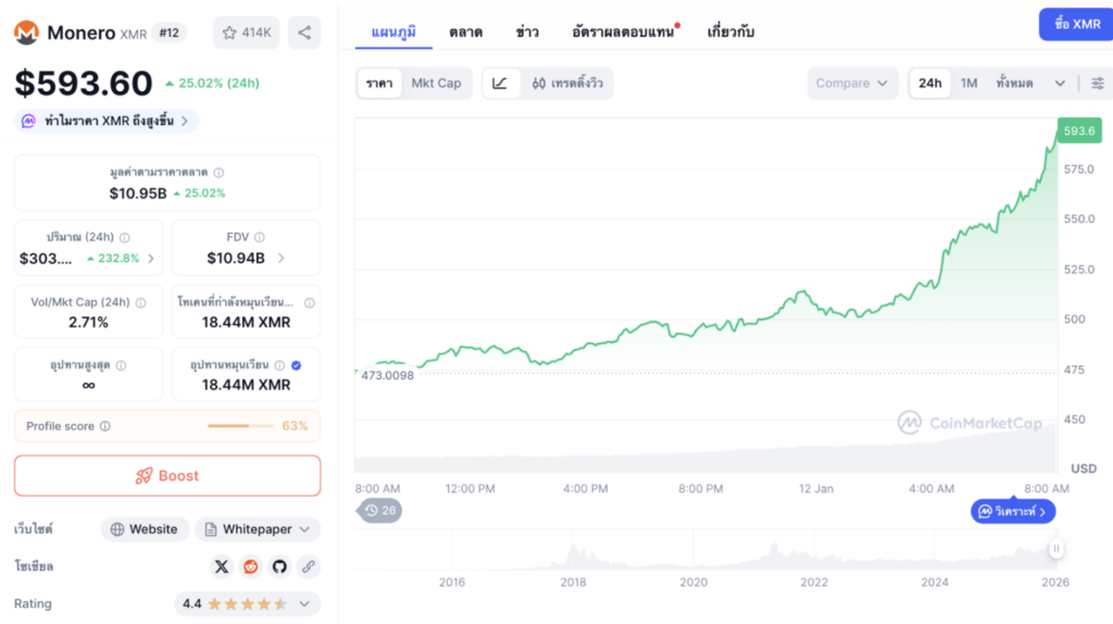 ราคาของ XMR ปรับตัวขึ้น 40% ในรอบ 7 วัน และหากมองในช่วง 12 เดือนที่ผ่านมา ราคาพุ่งขึ้นถึง 197% ซึ่งเป็นอัตราการเติบโตที่เหนือกว่าเหรียญหลักอย่าง Bitcoin (BTC) และ Ethereum (ETH)