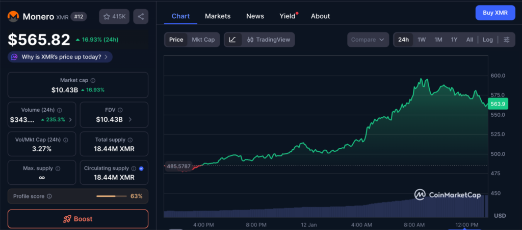 ข้อมูลล่าสุด ณ วันที่ 12 มกราคม 2026 ชี้ให้เห็นว่า ราคา XMR พุ่งแรงกว่า 30% ภายในไม่กี่วัน จนมาซื้อขายอยู่เหนือระดับ 585 ดอลลาร์ และดันมูลค่าตลาดไปแตะ 10,700 ล้านดอลลาร์ เรียบร้อยแล้ว