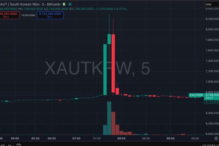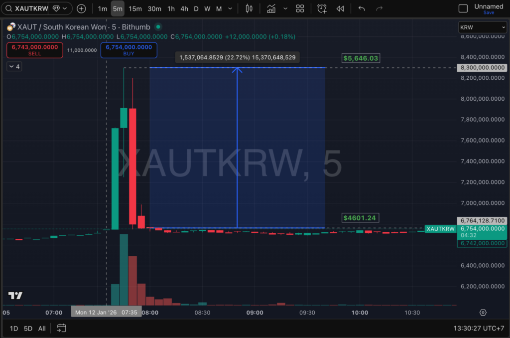 ข้อมูลจากกระดานเทรดเกาหลีใต้ Bithumb เผยให้เห็นกราฟราคาที่ปรับตัวขึ้นอย่างบ้าคลั่ง ในช่วงเช้าเวลา 7.40 น. ถึง 8.00 น. โดยราคา XAUT ในคู่เทรดเงินวอน (KRW) ดีดตัวขึ้นไปทำจุดสูงสุดที่ 8.3 ล้านวอน/ทรอยออนซ์ หรือเทียบเท่าประมาณ $5,646/ทรอยออนซ์