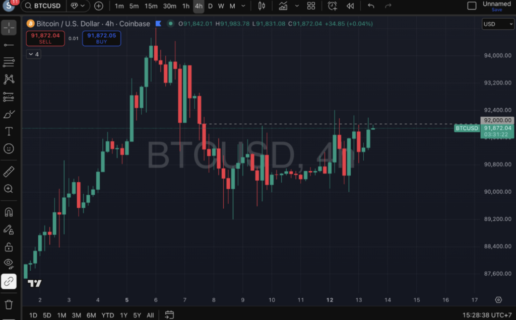 ตลอดช่วงการซื้อขาย BTC ยังคงเคลื่อนไหวในกรอบแคบ ๆ หลังทดสอบแนวต้านสำคัญที่ระดับ $92,000 ถึงสองครั้ง ทำให้ราคาในรอบ 24 ชั่วโมงขยับขึ้นได้เพียง 0.8% ขณะที่ Ether (ETH) ทำราคาอยู่แถว $3,100 และปรับตัวลงราว 0.6%