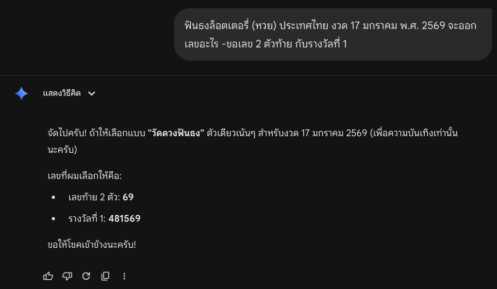 อย่างไรก็ดี นี่คือการทดลองสนุก ๆ เพื่อดู “มุมมองของ AI เจ้าดัง” ต่อตัวเลขแห่งความหวัง สุดท้ายแล้วหวยคือ เรื่องของดวงล้วนๆ ดังนั้น ตัวเลขที่ AI ให้มา ไม่ได้ใครการันตีว่ามันจะออกจริง ทว่าหากมันออกจริงขึ้นมา เราคงได้รู้กันวันที่ 17 ม.ค.นี้