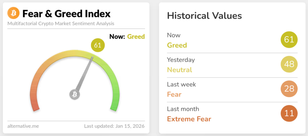 อ้างอิงข้อมูลจากดัชนี คะแนนเฉลี่ยในวันนี้ (15 มกราคม) ได้ขยับกลับขึ้นมาอยู่ที่ 61 คะแนน ซึ่งถือเป็นจุดสูงสุดนับตั้งแต่เดือนตุลาคมก่อนที่จะเกิดเหตุการณ์ล้างพอร์ตครั้งใหญ่ในวันที่ 10 เดือน 10 ซึ่งแสดงให้เห็นว่าความเชื่อมั่นของนักลงทุนเริ่มกลับมาแล้วเมื่อ Bitcoin ขยับเข้าใกล้เป้าราคาที่ $100,000