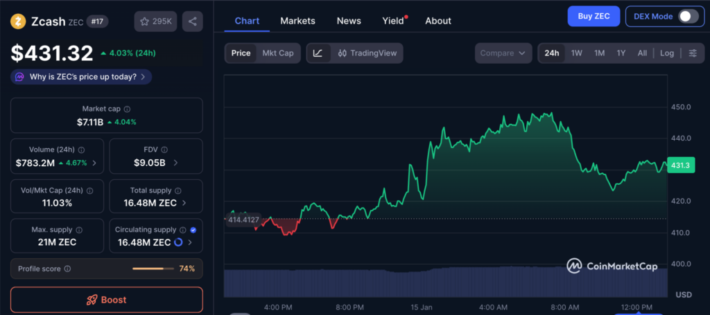 ในขณะที่รายงาน ราคา Zcash กำลังซื้อขายอยู่ที่ 431 ดอลลาร์ เพิ่มขึ้น 4.03% ภายใน 24 ชั่วโมง อ้างอิงข้อมูลจาก coinmarketcap