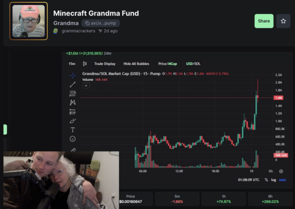 แต่จุดเปลี่ยนก็เกิดขึ้น เมื่อมีผู้ใช้งาน X ชื่อ Kimbazxz เล็งเห็นความตั้งใจของคุณยาย เลยไปสร้างเหรียญมีมชื่อ “Minecraft Grandma Fund” (เหรียญ Grandma) บนแพลตฟอร์ม Pump.fun เพื่อระดมทุนช่วยคุณยาย