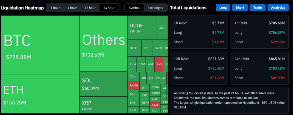 อ้างอิงข้อมูลจาก Coinglass พบว่าในช่วง 24 ชั่วโมงที่ผ่านมา มีการ Liquidation สัญญาฟิวเจอรส์ คิดเป็นมูลค่าความเสียหายรวมกว่า $865 ล้าน โดยส่วนใหญ่เกิดขึ้นกับโพสิชันในฝั่งของ Long และมีนักเทรดกว่า 242,819 รายที่ได้รับผลกระทบ