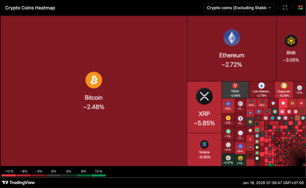 สำหรับสาเหตุที่ทำให้ Bitcoin ร่วงอย่างรุนแรงในเช้าวันนี้เป็นผลมาจากความเคลื่อนไหวของตลาดฟิวเจอร์สของหุ้นสหรัฐฯที่เริ่มเกิดการเทขายอย่างหนัก ซึ่งมีสาเหตุมาจากความตึงเครียดระหว่างสหรัฐฯ และสหภาพยุโรปในประเด็นเรื่องของเกาะกรีนแลนด์ โดย ปธน.ทรัมป์ ได้ทำการหยิบยกภาษีนำเข้ามาเป็นเครื่องมือในการข่มขู่อีกครั้งทำให้นักลงทุนตื่นตระหนกและทำการเทขาย รวมไปถึงปัจจัยอื่นๆ เช่น ETFs และกฎหมาย CLARITY Act ที่ถูกเลื่อน