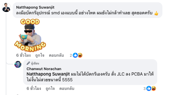 ขณะที่อีกคอมเมนต์ยกนิ้วให้กับความโหดของงานบัดกรี SMD ซึ่งเจ้าตัวก็ออกมาเฉลยแบบเป็นกันเองว่า ไม่ได้บัดกรีเอง แต่สั่ง JLC ทำ PCBA ให้ ไม่อย่างนั้นงานคงไม่เนี๊ยบขนาดนี้