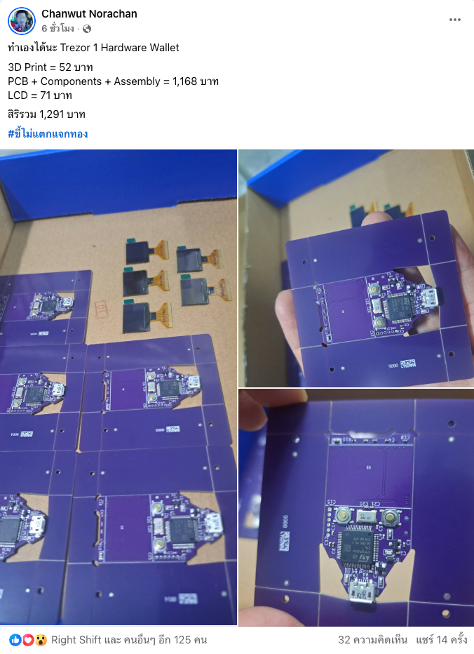 ใครจะไปคิดว่าอุปกรณ์เก็บเงินหมื่นเงินล้านอย่าง Hardware Wallet เราจะสามารถนั่งประกอบเองกับมือได้ แต่วันนี้ (19 ม.ค.) เหล่าคริปโตชาวไทยถึงกับต้องขยี้ตา เมื่อคุณ Chanwut Norachan (DJ Tar) ได้โพสต์โชว์ผลงานสุดเก๋าลงเฟซบุ๊กส่วนตัวว่า “ทำเองได้นะ Trezor 1 Hardware Wallet”