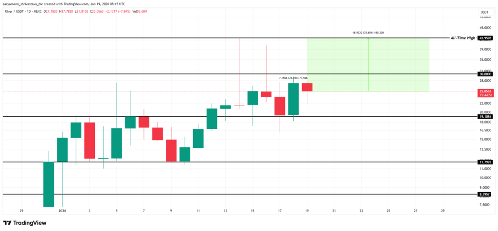 แม้ปัจจุบันราคาเหรียญ RIVER จะยังคงอยู่ห่างจากจุดสูงสุดเป็นประวัติการณ์ (ATH) ถึง 75% แต่โมเมนตัมล่าสุดกลับบ่งชี้ถึงสัญญาณการกลับตัวที่รุนแรง หลังราคาดีดตัวขึ้นกว่า 40% ภายในวันเดียว สะท้อนถึงความผันผวนในฝั่งขาขึ้นที่ดึงดูดฝั่งนักเก็งกำไร