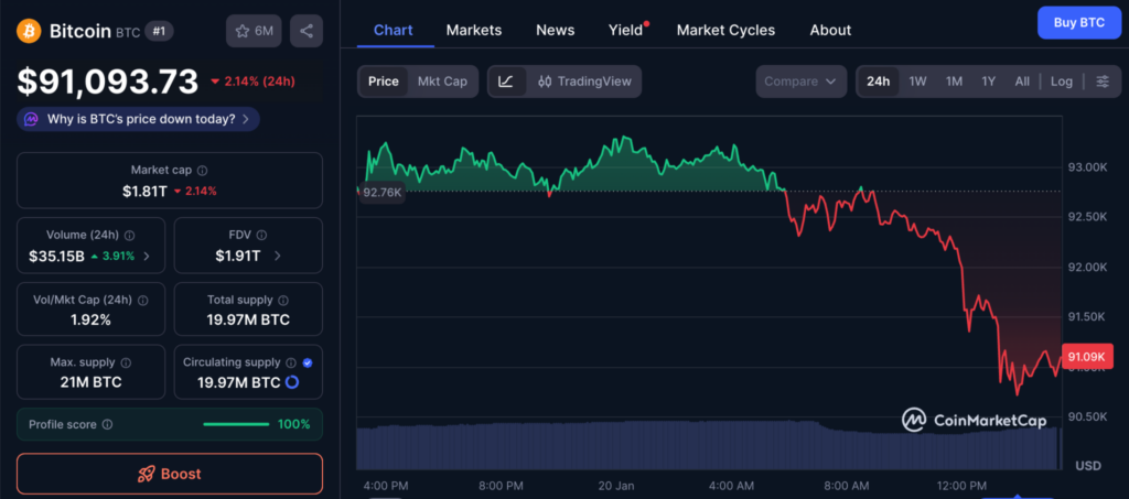 ในขณะที่รายงาน ราคา Bitcoin กำลังซื้อขายอยู่ที่ 91,093 ดอลลาร์ ลดลง 2.14% ภายใน 24 ชั่วโมง อ้างอิงข้อมูลจาก coinmarketcap