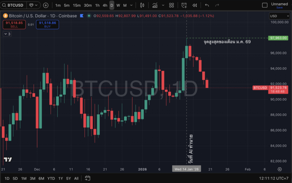 คำตอบที่ได้ระบุชัดเจนว่า “วันที่ 19 ม.ค. 69” ซึ่งเป็นวันเดียวกับที่ราคา Bitcoin ดิ่งลงจากจุดสูงสุดแถว $97,000 กลับมาสู่โซน $92,000 พอดีเป๊ะ ในช่วงเช้าของวันดังกล่าว