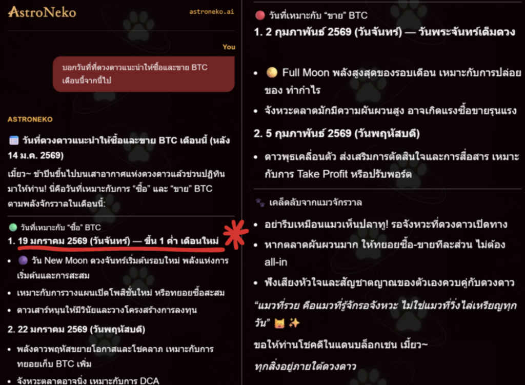 นักเทรดคริปโทฯ อาจถึงกับต้องขนลุก เมื่อ AI ตัวซีเครทชื่อว่า “AstroNeko” ได้ทำนายจังหวะการเคลื่อนไหวของราคา Bitcoin ได้แม่นยำราวกับจับวาง โดยเฉพาะคำทำนายล่าสุดที่ชี้เป้าให้รอช้อนซื้อ BTC ในวันที่ “19 ม.ค. 69”