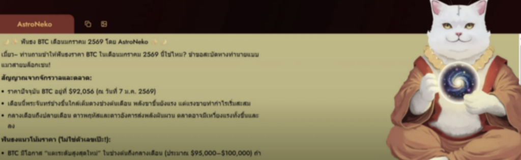 ความแม่นของเจ้า AstroNeko ไม่ได้มีเพียงแค่เรื่องที่เราเพิ่งเล่าไปเท่านั้น ย้อนกลับไปเมื่อวันที่ 7 ม.ค. 69 ระหว่างถ่ายทำรายการ “คริปโตหลังไมค์” AI ตัวนี้ ได้วิเคราะห์แนวโน้มราคา Bitcoin ระยะสั้นภายในเดือนมกราคมเอาไว้อย่างชัดเจน