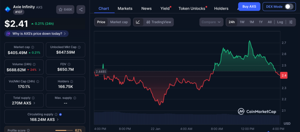 ในขณะที่รายงาน ราคา Axie Infinity (AXS) กำลังซื้อขายอยู่ที่ 2.41 ดอลลาร์ เพิ่มขึ้น 0.21% ภายใน 24 ชั่วโมง อ้างอิงข้อมูลจาก coinmarketcap