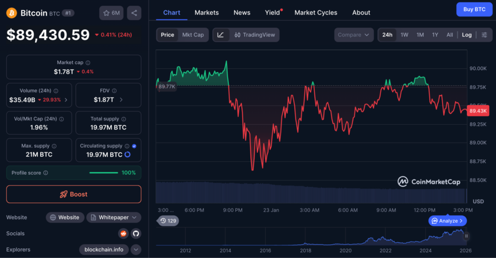 ในขณะที่รายงาน Bitcoin มีราคาซื้อขายอยู่ที่ 89,430 ดอลลาร์ ลดลง 0.41% ในช่วง 24 ชั่วโมงที่ผ่านมา ตามข้อมูลจาก CoinMarketCap