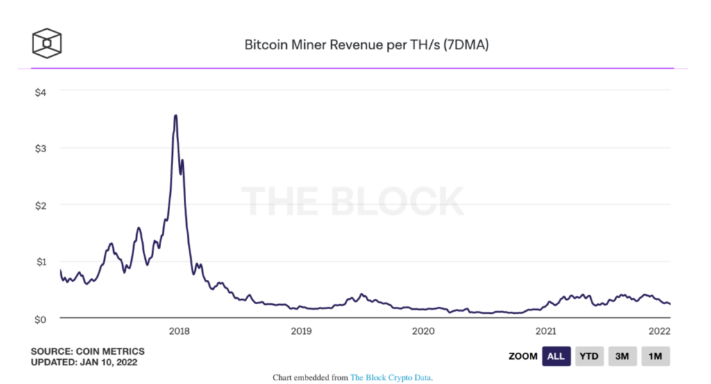 รายได้จากการขุดต่อ TH/s แหล่งที่มา: Coin Metrics จาก The Block Crypto Data