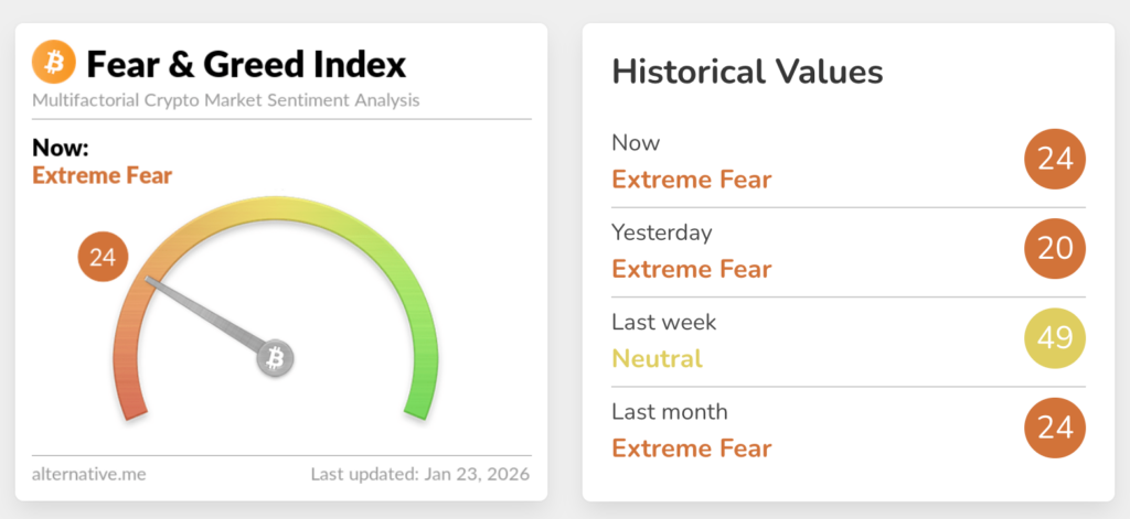 ความอ่อนแอของ Bitcoin ยิ่งแสดงให้เห็นชัดเจนขึ้น เมื่อดัชนี Crypto Fear & Greed Index ดิ่งลงสู่ระดับ 24 หรือเข้าสู่โหมด “กลัวสุดขีด” (Extreme Fear) อีกครั้ง หลังจากที่สัปดาห์ก่อนหน้า ดัชนีเพิ่งจะฟื้นตัวกลับไปสู่ภาวะ “ปกติ” ที่ระดับ 54 ได้เพียงชั่วคราวเท่านั้น