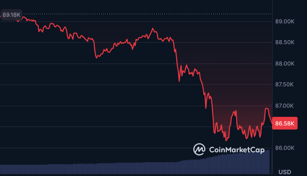 ราคา Bitcoin ในวันนี้ (26 มกราคม) ได้ประสบกับความผันผวนครั้งใหญ่ร่วงดิ่งอย่างรุนแรงกว่า 2.79% ในช่วง 24 ชั่วโมงที่ผ่านมา จากระดับราคา $89,000 จนเกือบทะลุ $86,000 ในช่วงกลางดึกที่ผ่านมา