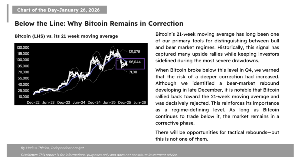 Matrixport ชี้ให้เห็นว่า ขณะนี้ราคา Bitcoin กำลังซื้อขายอยู่ “ต่ำกว่า” เส้น 21-week MA ซึ่งในทางเทคนิคแล้ว นี่ไม่ใช่สัญญาณที่ดีนัก เพราะ