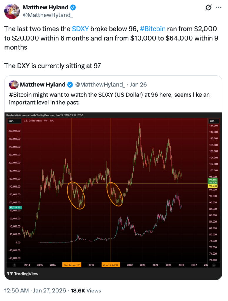 Hyland ประเมินว่าคู่เทรด BTC/USD จะขยับขึ้นเมื่อ DXY ปรับตัวลงไปต่ำกว่าระดับ 96 ดังที่เคยเกิดขึ้นมาแล้วในปี 2017 และ 2022