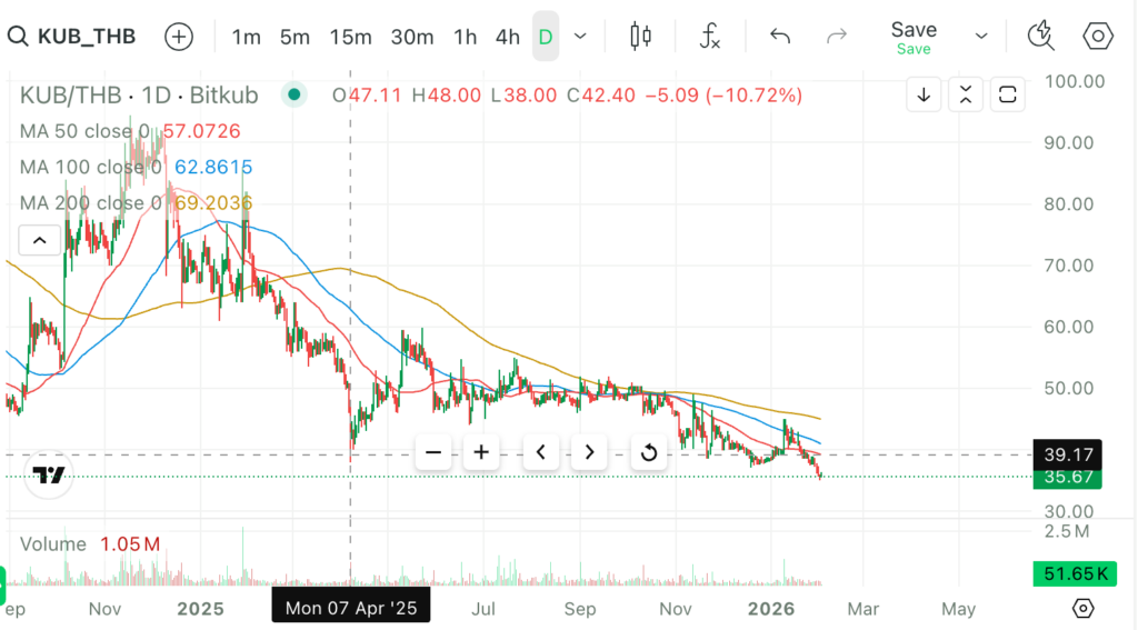 สถานการณ์ของ KUB Coin ในวันนี้ (2 กุมภาพันธ์ 2026) เรียกได้ว่าสร้างหวาดเสียวให้กับนักลงทุนไม่น้อย เมื่อกราฟราคาไหลรูดลงมาทดสอบแนวรับสำคัญที่ 35 บาท