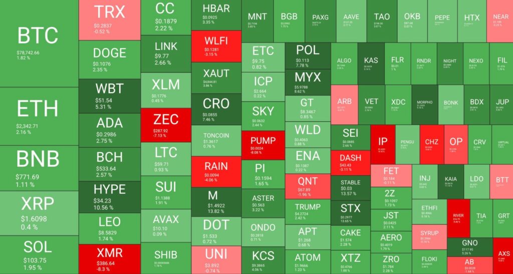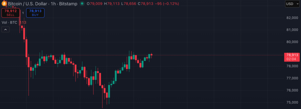 อ้างอิงข้อมูลจากกราฟ BTC/USD บน Tradingview ปัจจุบันราคา Bitcoin มีการซื้อขายอยู่ที่ระดับประมาณ $78,800 ซึ่งถือเป็นการดีดตัวขึ้นราว ๆ 2% ในช่วง 24 ชั่วโมง และฟื้นตัวขึ้นมากถึง 6% เมื่อเทียบกับจุดต่ำสุดของวันจันทร์ที่ราคาร่วงทะลุหลุด $75,000 ลงไปสร้างความหวาดผวาให้กับตลาด