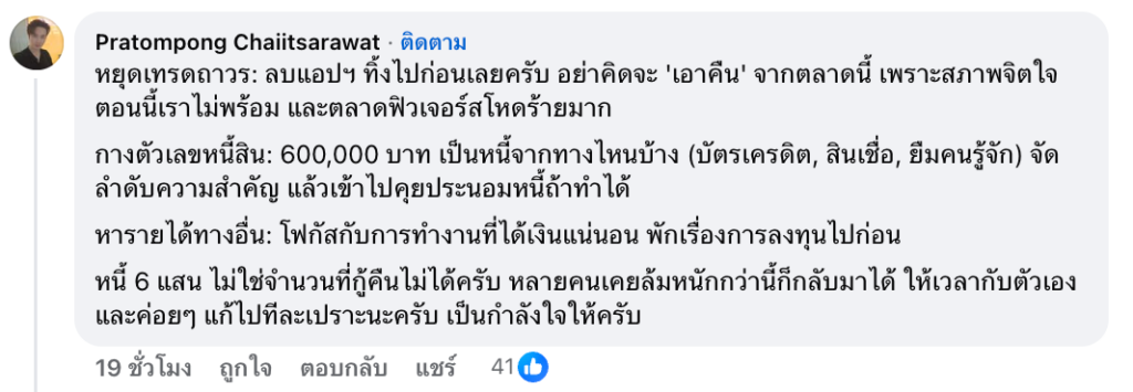 หนึ่งในคำแนะนำที่ได้รับความสนใจคือ การเตือนให้เธอหยุดเทรดถาวร ลบแอปฯ เพื่อไม่ให้ตกอยู่ในกับดักการเอาคืน พร้อมให้กางตัวเลขหนี้ 600,000 บาทว่า เป็นหนี้จากที่ไหนบ้าง จัดลำดับและประนอมหนี้ พร้อมหันไปโฟกัสหารายได้ที่แน่นอน และย้ำว่าหนี้ก้อนนี้ไม่ใช่สิ่งที่แก้ไม่ได้ หลายคนเคยล้มหนักกว่านี้ก็ยังกลับมาได้
