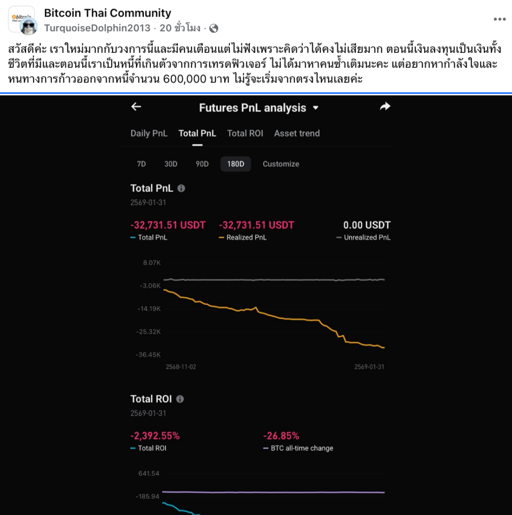 เรื่องราวนี้กลายเป็นอุทาหรณ์ที่สอนใจนักลงทุนไม่น้อย เมื่อโลกของการเทรดที่หลายคนมองว่า สร้างโอกาส กลับพาใครบางคนไปติดกับดักหนี้ก้อนโต โดยเมื่อวันที่ 3 กุมภาพันธ์ที่ผ่านมา มีผู้ใช้งาน Facebook รายหนึ่ง ที่ชื่อ TurquoiseDolphin2013 ได้โพสต์ข้อความ และรูปภาพการขาดทุนลงในกลุ่ม Bitcoin Thai Community เพื่อขอกำลังใจ และแนวทางให้การแก้หนี้มูลค่า 600,000 บาท ที่เกิดจากการกู้เงินมาเทรดคริปโตฟิวเจอร์ส
