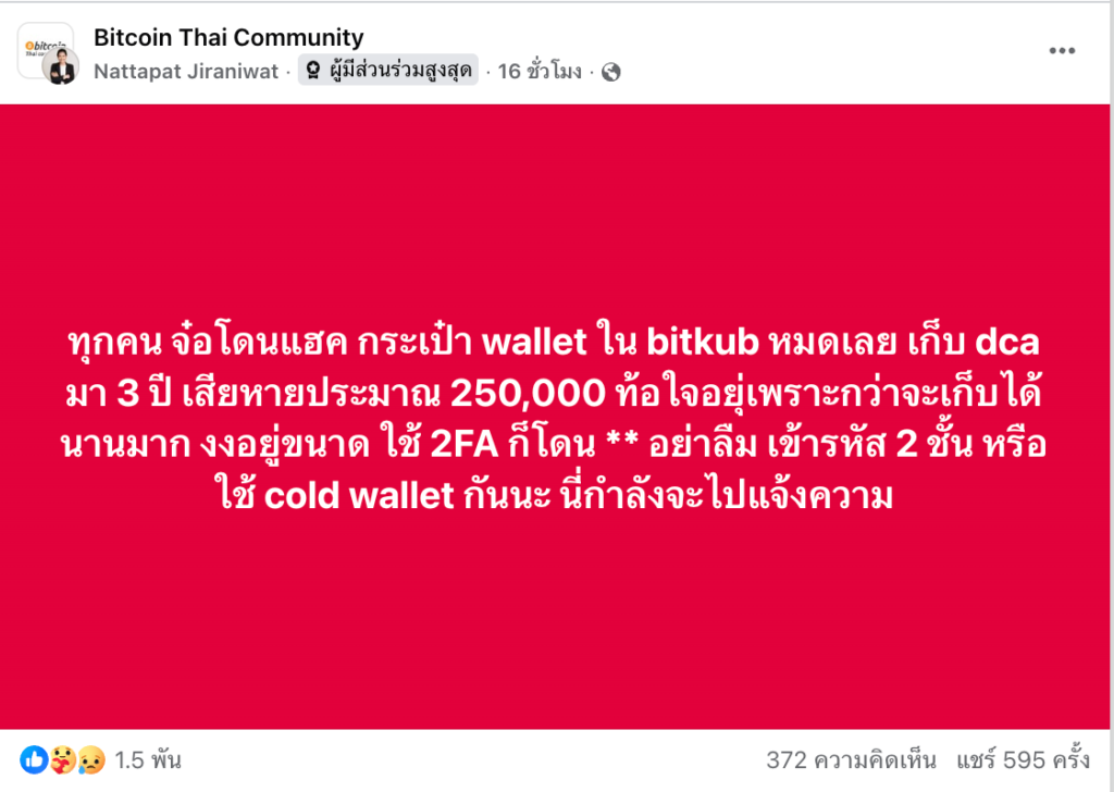 จากกรณีที่มีนักลงทุนรายหนึ่งได้แสดงความคิดเห็นลงในกลุ่ม Bitcoin Thai Community เมื่อวันที่ 4 ก.พ. ที่ผ่านมาว่า โดนแฮ็กกระเป๋า wallet เสียหายกว่า 250,000 บาท พร้อมเตือนภัยให้นักลงทุนเปิดใช้งาน 2FA หรือใช้ Cold wallet เพื่อความปลอดภัยของการรักษาสินทรัพย์ดิจิทัล