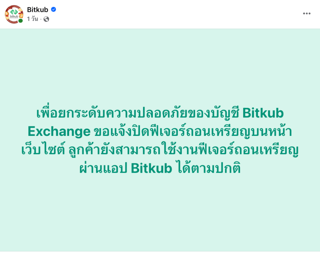 ล่าสุดทาง Bitkub ได้ประกาศปิดการทำธุรกรรมถอนเหรียญ (Coin Withdrawal) สำหรับลูกค้าชาวไทย ผ่านหน้าเว็บไซต์ www.bitkub.com เพื่อยกระดับความปลอดภัย โดยจะมีผลตั้งแต่วันที่ 10 กุมภาพันธ์ 2569 เป็นต้นไป พร้อมแจงวิธีดูแลบัญชีให้มีความปลอดภัย ดังนี้