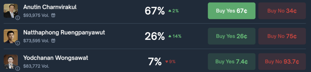อย่างไรก็ตามแม้ว่าผู้ใช้งานทั่วโลกจะคาดว่าพรรคประชาชนเป็นฝ่ายชนะในการเลือกตั้งครั้งนี้ แต่ตำแหน่งนายกรัฐมนตรีกับคาดว่าจะตกเป็นของ นาย อนุทิน ชาญวีรกูล ตัวแทนผู้สมัครจากพรรคภูมิใจไทยด้วยคะแนนถึง 67% ในขณะที่หัวหน้าพรรคประชาชนอย่าง “เท้ง” ณัฐพงษ์ เรืองปัญญาวุฒิ กลับมีความเป็นไปได้เพียง 26% เท่านั้นที่จะได้เป็นนายกรัฐมนตรี ทั้งๆ ที่โพลอีกแห่งระบุว่าพรรคประชาชนจะชนะการเลือกตั้ง แสดงให้เห็นถึงความซับซ้อนของการเมืองในประเทศไทย