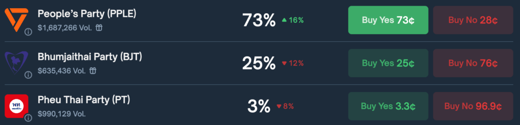 อ้างอิงข้อมูลจาก Polymarket แพลตฟอร์มพยากรณ์ที่ว่ากันว่ามีความแม่นยำเป็นอันดับต้นๆ แสดงให้เห็นว่าปัจจุบัน พรรคประชาชน หรือ “พรรคส้ม” กำลังทำคะแนนทิ้งห่างพรรคอื่นๆ อย่างขาดลอยด้วยคะแนนความน่าจะเป็นที่สูงถึง 73% ในโพล “พรรคใดจะได้เสียงข้างมากในสภาและชนะการเลือกตั้ง”