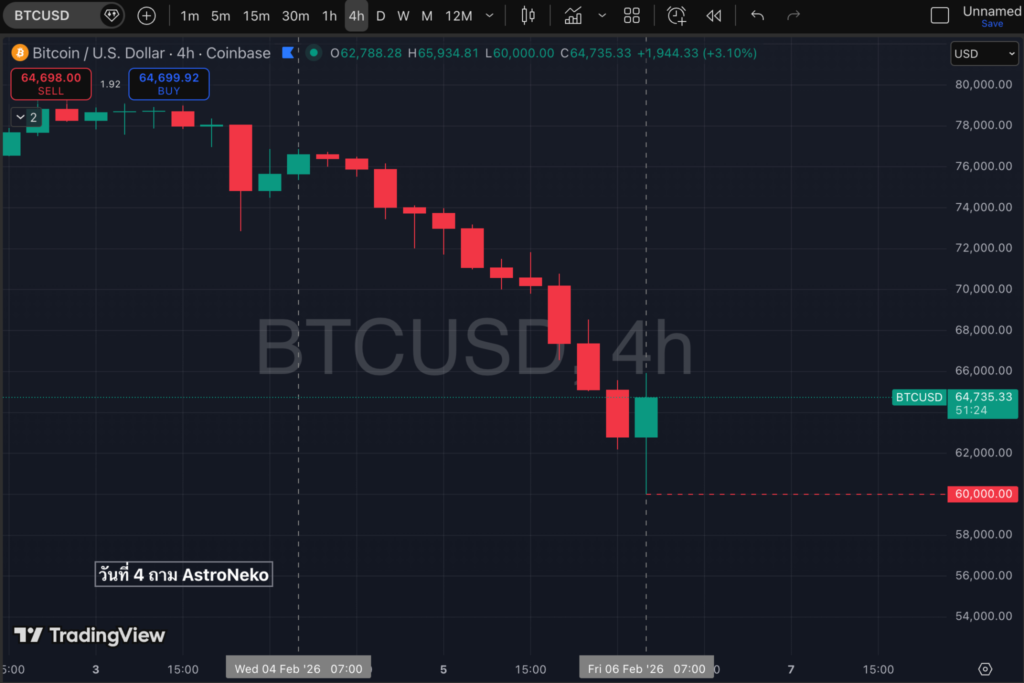 เมื่อวันที่ 4 ก.พ. AstroNeko  ได้เตือนไว้ชัดเจนว่า “ราคา Bitcoin มีโอกาสปรับฐานลงสู่ระดับ $60,000 – $65,000” ซึ่งหลังจากผ่านไปเพียง 2 วัน ฝันร้ายก็กลายเป็นจริง เมื่อแรงเทขายมหาศาลทุบราคาจาก $77,000 ร่วงดิ่งลงมาแตะจุดต่ำสุดที่ $60,000 เป๊ะตามคำทำนาย
