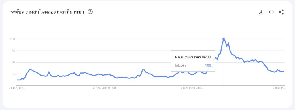 ข้อมูลจาก Google Trends ระบุว่า ตัวเลขการค้นหาคำว่า “Bitcoin” พุ่งขึ้นแตะระดับ 100 เมื่อวันที่ 6 กุมภาพันธ์ ที่ผ่านมา ซึ่งถือเป็นระดับสูงสุดในรอบ 12 เดือน สะท้อนความสนใจจากนักลงทุนรายย่อยที่เริ่มกลับมาอย่างชัดเจน