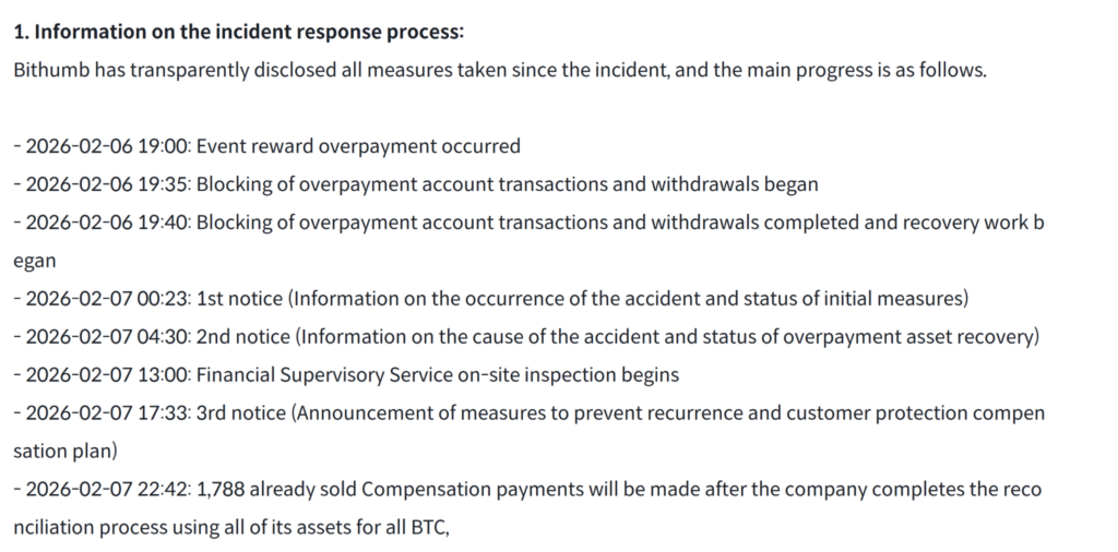 ทีมงานของ Bithumb จึงต้องงัดมาตรการฉุกเฉินออกมาทันที โดยเข้าระงับบัญชีที่มีปัญหาและควบคุมสถานการณ์ให้กลับสู่สภาวะปกติได้ภายในเวลาไม่กี่นาที พร้อมทั้งยืนยันว่า เหตุการณ์ดังกล่าวเป็นเพียงบั๊กของระบบภายในกระดานเทรด ไม่ใช่การถูกแฮ็กระบบจากภายนอก และไม่มีสินทรัพย์ของลูกค้าสูญหายแม้แต่เหรียญเดียว