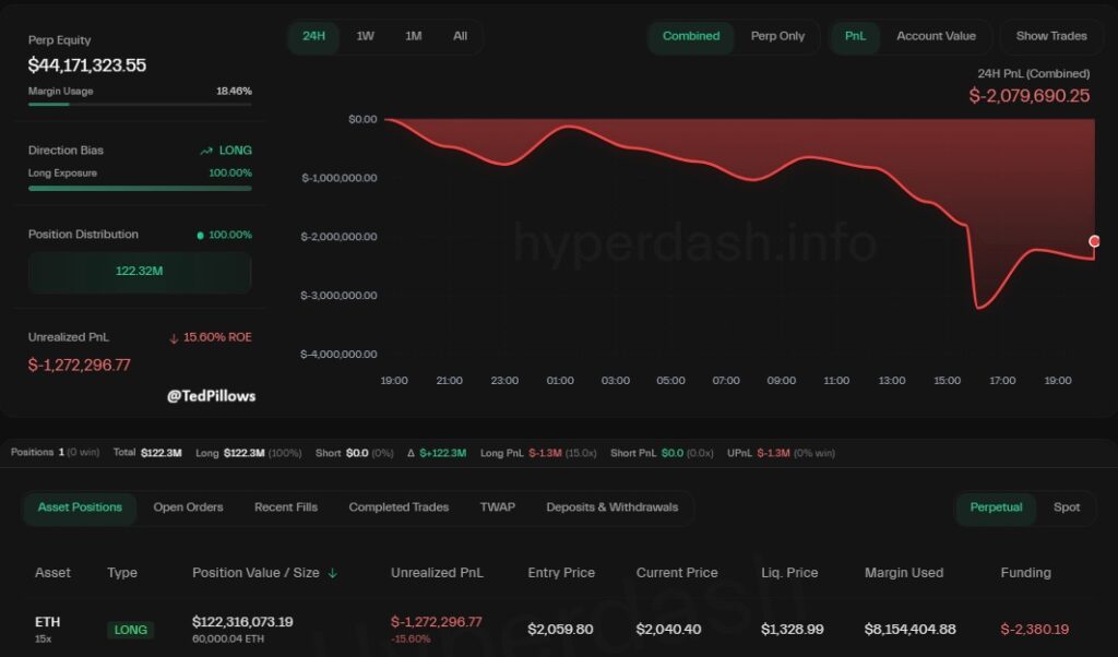 มีเจ้ามือรายหนึ่งเพิ่งเปิดสถานะ Long Ethereum มูลค่ามหาศาล 122.3 ล้านดอลลาร์ (ประมาณ 4,100 ล้านบาท) โดยใช้ Leverage ถึง 15 เท่า ตามรายงานจาก Ted Pillows เมื่อวันที่ 9 กุมภาพันธ์ 2026 โดยสถานะนี้มีจุดล้างพอร์ต (Liquidation Price) อยู่ที่ 1,329 ดอลลาร์ ซึ่งห่างจากราคาปัจจุบันของ ETH ที่ประมาณ 2,600 ดอลลาร์ประมาณ 49% การเปิดสถานะ Leverage สูงเช่นนี้ในช่วงที่ตลาด Crypto ยังคงผันผวน สะท้อนถึงความเชื่อมั่นสูงมากของเจ้ามือรายนี้ต่อการฟื้นตัวของ Ethereum