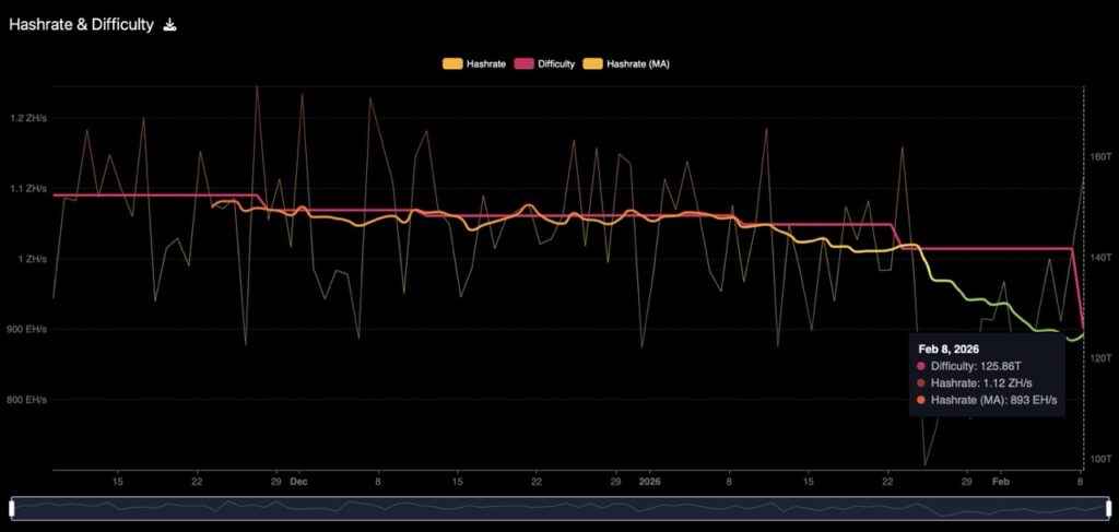 นักวิเคราะห์พบว่า ค่า Mining Difficulty ที่ลดลงสอดคล้องกับ Hashrate รวมของเครือข่ายที่หายไปเกือบ 20% ในช่วง 30 วันที่ผ่านมา โดยข้อมูลจาก Luxor Technology ระบุว่า Hashrate ปรับตัวลงกว่า 11% ภายในสัปดาห์เดียว เหลือประมาณ 893 EH/s จากจุดสูงสุดกว่า 1.1 ZH/s เมื่อเดือนตุลาคม