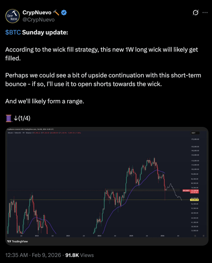 โดยนักเทรดอย่าง CrypNuevo มองว่า นี่อาจเป็นการดันราคาขึ้น เพื่อล้างพอร์ตฝั่ง Short ในช่วง $72,000–$77,000 ก่อนที่ราคาจะวกกลับมาปิดช่องว่างของไส้เทียนด้านล่างให้สมบูรณ์ ซึ่งอาจหมายถึงการกลับไปทดสอบจุดต่ำสุดเดิมอีกครั้ง