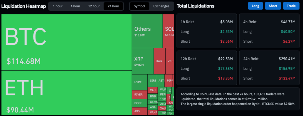 ขณะเดียวกัน Coinglass ยังบ่งชี้ว่าการล้างพอร์ตของนักลงทุนได้ชะลอตัวในวันนี้ มีการล้างพอร์ตเกิดขึ้นประมาณ $290 ล้าน ซึ่งถือเป็นระดับที่ยังไม่น่าเป็นกังวล
