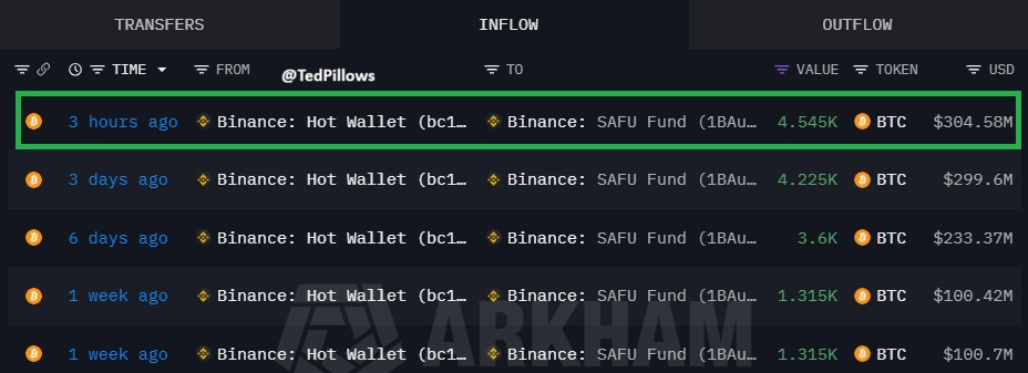 ข้อมูลจาก Arkham แพลตฟอร์มวิเคราะห์บล็อกเชน ยืนยันว่า Binance ได้โอนบิตคอยน์ล็อตสุดท้ายจำนวน 4,545 BTC มูลค่า 304.6 ล้านดอลลาร์ หรือราว 1 หมื่นล้านบาท เข้าสู่กระเป๋าเงินของกองทุน SAFU เป็นที่เรียบร้อย ส่งผลให้กองทุนนี้มีบิตคอยน์สะสมครบ 15,000 BTC ซึ่งมีมูลค่ารวมตามราคาตลาดปัจจุบันที่ 1 พันล้านดอลลาร์พอดี