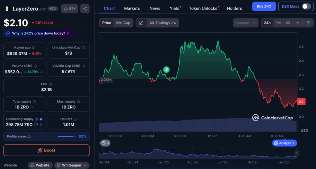 ในขณะที่รายงาน ราคา ZRO กำลังซื้อขายอยู่ที่ 2.10 ดอลลาร์ ลดลง 7.8% ภายใน 24 ชั่วโมง อ้างอิงข้อมูลจาก coinmarketcap