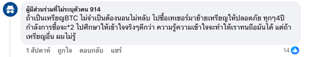 รวมทั้งยังมีชาวเน็ตอีกหลายรายที่เข้ามาช่วยปลอบประโลมใจ โดยมองว่า หากสินทรัพย์ที่ถือครองคือ Bitcoin จริงๆ ระยะเวลา 4-5 ปีที่เหลือ ก่อนคุณแม่จะเกษียณยังถือว่า ยาวนานพอ ที่วัฏจักรราคาจะกลับเป็นขาขึ้นอีกครั้ง