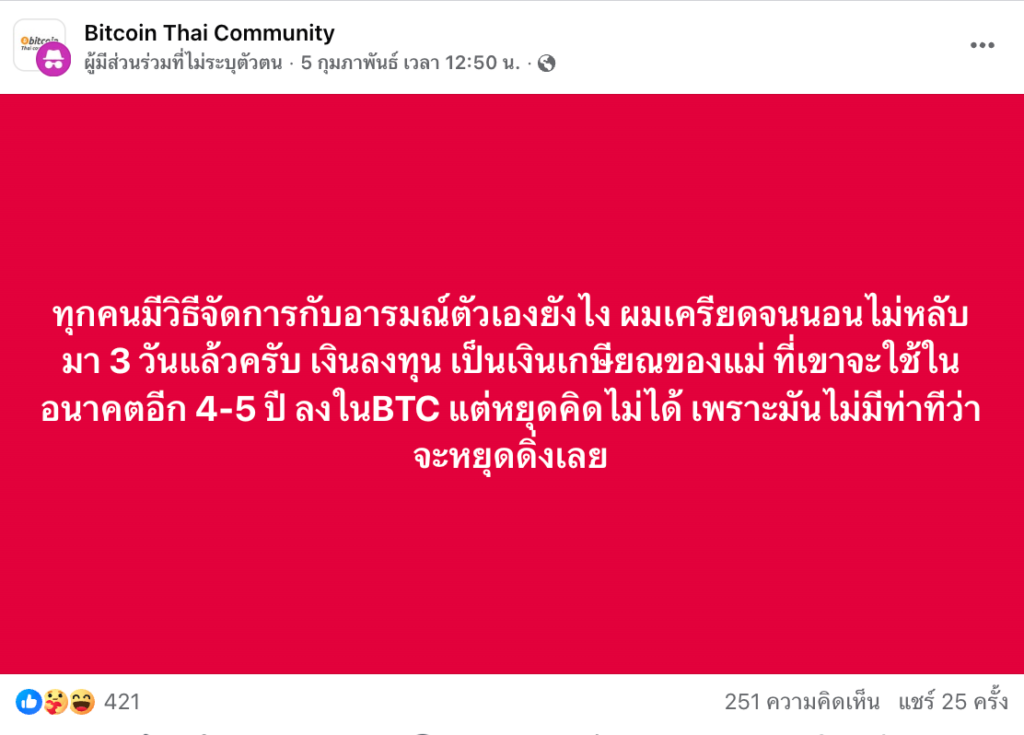 - หนุ่มไทยโพสต์ระบายความเครียด ขอวิธีการจัดการอารมณ์ตัวเอง หลังนำเงินเกษียณของคุณแม่จำนวน 300,000 บาท มาลงทุนใน Bitcoin แต่เจอช่วงตลาดขาลงจนพอร์ตติดลบไปแล้วกว่า 120,000 บาท