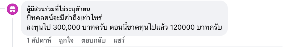 เจ้าตัวระบุว่า ได้นำเงินเก็บสำหรับใช้ยามเกษียณของคุณแม่มูลค่า 300,000 บาท มาลงทุนใน Bitcoin เพราะหวังสร้างผลตอบแทนในระยะยาว ทว่าโชคร้ายที่จังหวะการเข้าซื้อกลับกลายเป็นช่วงที่ราคาดิ่งเหวไม่หยุด ส่งผลให้ปัจจุบันพอร์ตติดลบไปแล้วถึง 120,000 บาท