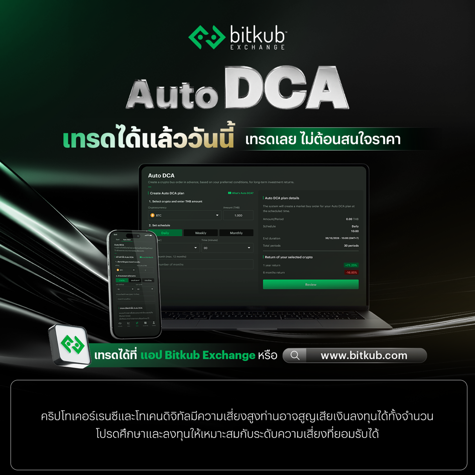 - Bitkub เปิดตัวระบบ Auto DCA เครื่องมือช่วยลงทุนอัตโนมัติเพื่อสร้างวินัยการออมระยะยาว ลดความกดดันจากการเฝ้าหน้าจอ