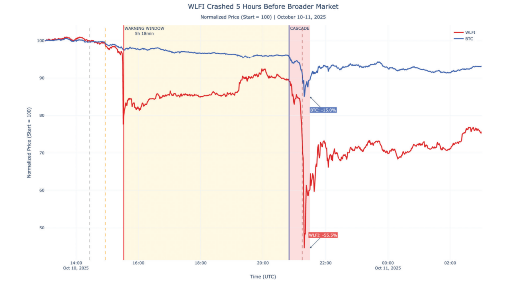 Mike Marshall หัวหน้าฝ่ายวิจัยเปิดเผยว่าโทเคน WLFI มีความเคลื่อนไหวอย่างรุนแรงจนเห็นได้ชัดในช่วงก่อนหน้าที่จะเกิดเหตุล้างพอร์ตขึ้น ซึ่งในขณะนั้นเอง Bitcoin ยังไม่ได้ส่งสัญญาณร่วงรุนแรง และยังทรงตัวอยู่เหนือ $120,000