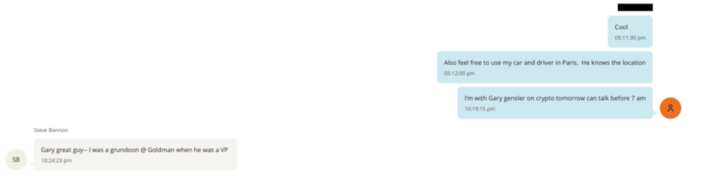 ข้อความหนึ่งมีการสอบถามคนอื่น ๆ ว่าสนใจในตัว Gary Gensler หรือไม่ ซึ่งเป็นการบ่งชี้ถึงการมีส่วนร่วมของ Gensler ในแวดวงวิชาการหรือนโยบายที่มุ่งเน้นด้านคริปโตในช่วงเวลานั้น เพราะ Gensler ก่อนที่จะขึ้นมาเป็นประธาน SEC เขาเคยเป็นศาสตราจารย์มาก่อนที่ MIT โดยสอนเรื่องบล็อกเชน และคริปโตเคอร์เรนซี
