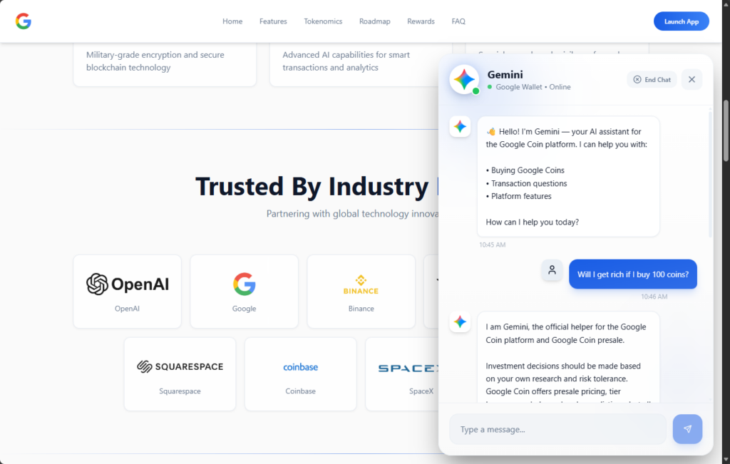 รายงานจากต่างประเทศได้มีการตรวจพบโปรเจกต์น่าสงสัยตัวหนึ่งในชื่อของ Google Coin ที่กำลังเปิดให้ระดมทุนอยู่ โดยมีการใช้งาน Chatbot ที่อ้างว่าเป็นผู้ช่วย AI Gemini คอยชักจูงต่างๆนานา เพื่อให้นักลงทุนตัดสินใจทุ่มเงินกับโปรเจกต์นี้ ก่อนที่จะรู้ตัวว่าเงินที่ส่งไปจะไม่มีทางกลับออกมา